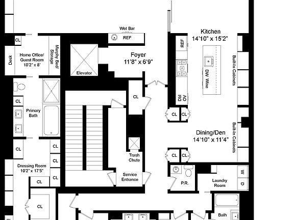 The elevator opens directly into a gracious Foyer which leads to a Great Room with nearly 50 feet of linear frontage. The space, renovated to perfection and with wall-to-wall south-facing windows, is ideal for entertaining with three separate Living Areas and a custom marble and white oak Bar with Julien sink, 30" Sub-Zero refrigerator and ice maker. Other features in the Great Room include a wall of custom oak millwork adding tremendous warmth and character, concrete ceilings with breathtaking light fixtures and a stunning steel and glass wall with doors that lead to a large formal Dining Area with an antiqued mirror and cerused oak backdrop. Off this Dining Area is an Open Chef's Kitchen outfitted with custom and extensive floor-to-ceiling cabinetry, a honed black Saint Laurent marble center island and a full suite of Gaggenau appliances including a wine refrigerator and vented range hood. Adjacent to the Open Chef's Kitchen in this extremely flexible family home is an informal Dining Area, fitted with additional cabinetry and ample storage, that can easily be converted to a Den or Playroom.