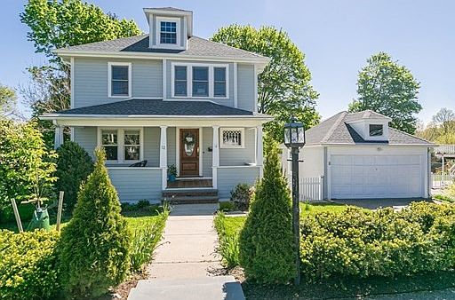 Oozing with charm, this 1920s colonial has front and back porches and is situated on a large fenced lot. A 2020 exterior upgrade features HardiePlank siding and new roof.The freshly painted kitchen just received a facelift featuring new cabinet doors, new hardware and new fixtures.Here you'll also find stainless appliances, granite counters and a perfectly built-in breakfast nook.The formal dining room boasts a built-in china cabinet and opens to an inviting living room with gas fireplace.The second floor offers 3 spacious bedrooms, a full bath and a bonus area, perfect for an office space or nursery.There is also a walk-up attic convenient for storage or potential expansion. A walk-out basement provides great additional living space with tall ceilings, great light, a workshop area and lots of storage. Conveniently located for commuters and within walking distance to Eliot elementary school. This home is completed with central air, a two-car garage, mudroom area and newer systems.