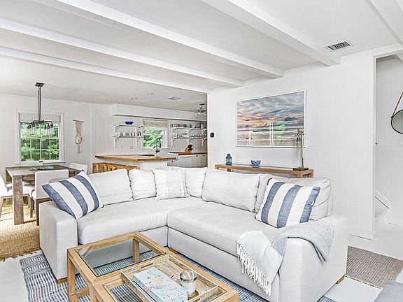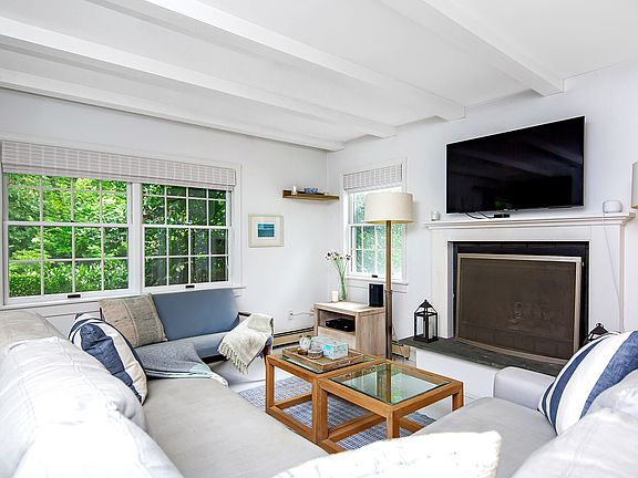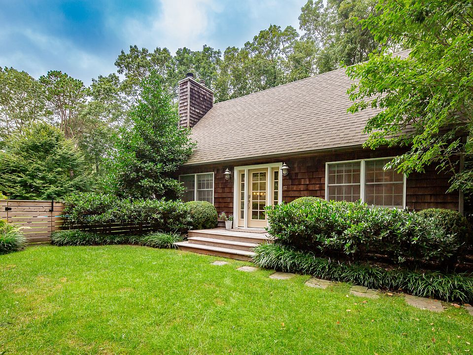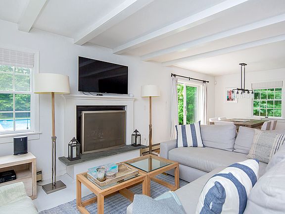 Located on quiet tree-lined street, moments to East Hampton Village and Ocean Beaches, find this immaculate, bright and open cape cod style home on a private +/- .41 acres. The first floor offers a modern interior and open floor plan with fully equipped kitchen, dining area, and living room with wood burning fireplace. There is a spacious first floor primary bedroom with en-suite bathroom sited on its own wing for privacy. The second story boasts two large guest bedrooms and full bathroom. The 400 sq. ft. finished lower level has a recreation room, laundry area, and size-able fourth bedroom. Sliding doors off the dining room open to expansive decking and green lawn that seamlessly flows to large, heated pool with bluestone lounging patio. The property is surrounded by lush gardens, mature plantings, and specimen trees creating ultimate privacy.