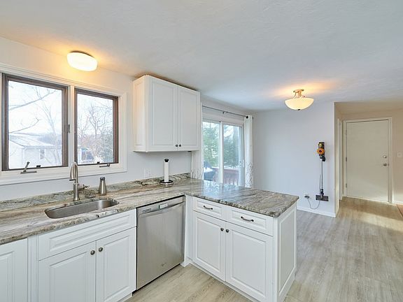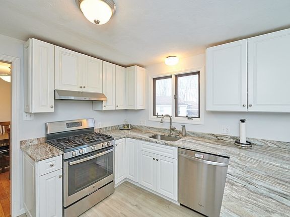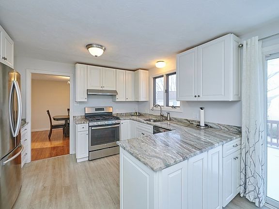 Beautifully renovated gambrel colonial home located in desirable North Framingham features modern eat in kitchen with breakfast nook, granite countertops, stainless appliances, pantry, and plenty of cabinets. The living room with plenty of natural light, a dining room, and family room with wood burning fireplace completes the first floor. The second floor has a master bedroom, master bath and giant walk-in closet, plus two more large bedrooms having ample closet space and another full bath. The unfinished walkout basement has a full sized window and high ceilings with potential to finish for additional living space. The house was renovated in 2016-2017 with new kitchen, bathrooms, and flooring, with additional updates including new hot water heater(2021), A/C condenser(2021). Additional features include low maintenance vinyl siding, vinyl replacement windows, central A/C, and gas heating. Conveniently located to all major highways, public transportation, restaurants and shopping.