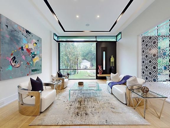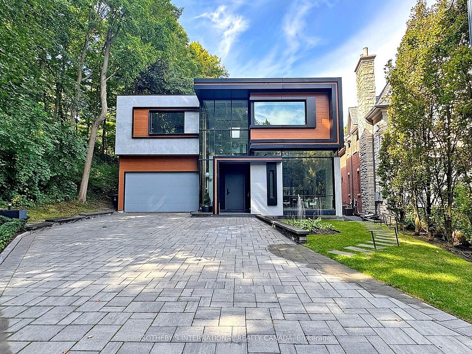 The main level boasts an *open-concept layout* with a double-sided wall aquarium, Spacious principal rooms, gourmet kitchen, multiple serveries, outstanding millwork, artistic accent walls, and unique ceiling designs. Glass railings, custom lighting, and recessed features enhance the architectural flow. Retreat upstairs to the *year-round 2nd floor heated solarium with balcony, retractable windows and hot tub. This home is equipped with a Private glass elevator that spans all levels, multiple gas fireplaces, sound system with built-in speakers and Home Automation. 2 furnaces, 2 CAC, CVAC, and full security with cameras complete the homes impressive features. The lower level is an entertainers dream: 5th bedroom with ensuite, home theater room, Infrared Sauna, entertainers bar, enclosed kitchen, fitness room, spacious rec area with stunning wine wall, and walkout to the yard. The rear grounds are pure resort luxury with pool + waterfall, spacious patio, built-in BBQ, custom lighting & professional landscaped that further extends surrounded by a Private Treed Lot and beyond. For convenience, this home features a generator, heated Driveway, back patio and Walk-In landing into the basement.