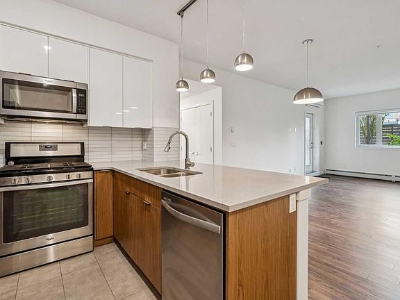 Modern finishesAir conditioningSleek kitchenWhirlpool stainless steel appliancesGas stoveQuartz countertopsUnder-cabinet lighting
