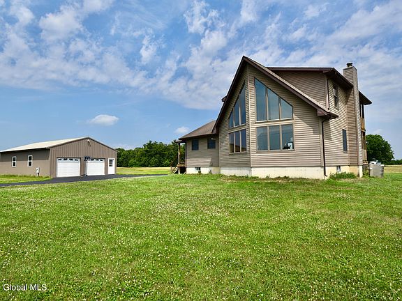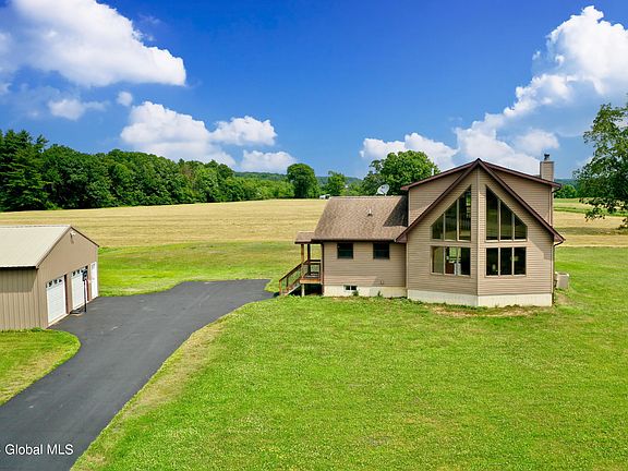 Welcome to this impeccably maintained home on 5 acres in the Schuylerville school district. This property features a main floor bedroom and bathroom, with two additional bedrooms and a bathroom upstairs. The open concept layout, bathed in beautiful south-facing natural light, is ideal for large gatherings. Wide open fields offer potential for a pool. Enjoy the natural setting with horses grazing across the road, visible from the large front windows, and mountain views from the two-level porch overlooking the backyard. The basement boasts a custom mahogany bar, entertainment room, and office space. An oversized 2-car garage provides ample storage. Conveniently located less than 15 minutes from I-87 and 20 minutes to downtown Saratoga.