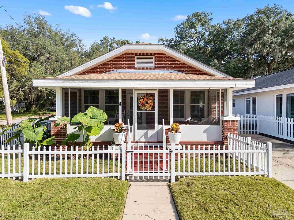 Charming 2 bedroom, 2 bath brick home on a corner lot, in East Pensacola Heights near Emmanuel Point offers water views, and is 2 bedrooms, 2 baths, and features 1550 square feet of living space. As you enter from the front, you'll be in the welcoming great room. Great room has water views, 9' ceilings, stained hardwood floors, stained tongue and groove ceilings, and is complete with a gas fireplace, and crown molding throughout the home. Beyond the great room is the dining area/ eat-in kitchen. The kitchen is complete with stainless steel appliances, range with gas cooktops and solid surface countertops. To the right of the home are 2 nice sized bedrooms with the same stained hardwood floors, and tongue and groove ceilings, and a full hall bath. Bedroom 2 connects to the rear foyer area that is a multifunctional space that lends itself to a rear entryway, laundry room and another full bath. Home is ADA compliant, and features wide doorways, halls and added height for proper living conditions. The rear of the home features a large 23' x 16' flex room that is currently being used as a craft room, but would make a great primary suite, or office space/play area. On the back side of the home, there is a large 20' x 12' shed to fit all you lawn and gardening equipment, and it provides storage for all your toys. A circular drive off of Jackson street provides ample room for parking, and house is tastefully landscaped for easy maintenance. Home is also complete with a whole-home Generac generator. Roof, HVAC & Tankless Gas water heater are all 9 years old. You'll not want to miss out on this charming East Pensacola brick home that offers not only prime location, but beautiful sunsets from your front porch.