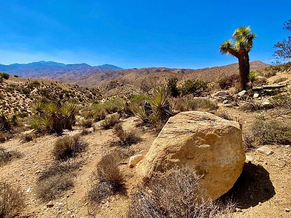 Private hilltop 5 acres with a slab! This secret pocket neighborhood in Morongo Valley is breathtaking. Only a few homes in this little hillside valley. Property offers commanding hilltop views with 360' panorama vistas. Totally amazing! Sloping down to the south end where trails lead several platu ridges and a wash. Abundant desert fauna. Boulders and rocky steep sections. No water in the area and power is one lot over. Might be ideal to go solar with a well. 5 acres would typically allow for 2 homes and some guest houses. Ideal for a luxury compound. Lots of BLM land close by for exploring and horseback riding. Not far from the Joshua Tree National Monument where about 3 million tourists visit annually. Hot vacation rental market. 24 miles to Palm Springs. 117 miles to downtown Los Angeles. Road to the property is currently blocked by the neighbor to the east. Best way to access the property is parking on Benmar and climbing the steep hill to the slab. Use caution and safety. Recommended GPS apps like Landglide or OnxHunt to see the lot lines. Buyers must contact the county planners for all questions on building. Buyers must contact all the appropriate utilities agencies with all questions on utilities. Property does not have a legal address, the address used is for marketing purposes only. Don't Wait! - Call Now! APN: 0585-261-20-0000 GPS: 34.099000, -116.485582