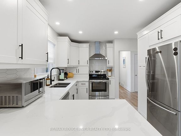 Stunning 3-bedroom bungalow in sought-after Blue Grass Meadows! Welcome to this beautifully updated bungalow perfectly situated on a large 50-foot lot in one of Whitby's most desirable neighbourhoods. Bathed in natural light from expansive windows, the inviting living room showcases elegant laminate flooring that flows seamlessly throughout the home. A stunning picture window provides a beautiful backdrop for everyday living and holiday celebrations alike. The open-concept dining area offers the ideal space for entertaining, enhanced by a striking statement light fixture with dimming capabilities to set the perfect mood. The gorgeous chef-inspired kitchen features custom quartz countertops, a full-height backsplash, sleek stainless steel appliances, and modern white cabinetry accented with black hardware. A convenient bar seating area and cozy nook for a coffee or wine station complete this elegant space. All three bedrooms are located on the main floor, each featuring warm laminate flooring and abundant natural light. The finished basement offers incredible versatility with a spacious family room, pot lights, a large front room ideal as an office or gym, a 3-piece bath, and a separate entrance-perfect for extended family or guests. Step outside to your private backyard oasis. Professionally landscaped, this outdoor haven features lush sod, dual gated fencing, an expansive patio ideal for entertaining, a cozy fire pit seating area, and a practical storage shed. Mature tree removal has opened the space beautifully, allowing sunlight to flood your yard all day long. With a single-car garage, spacious driveway, and an unbeatable location close to parks, schools, and amenities, this exceptional home blends comfort, style, and convenience in one perfect package.