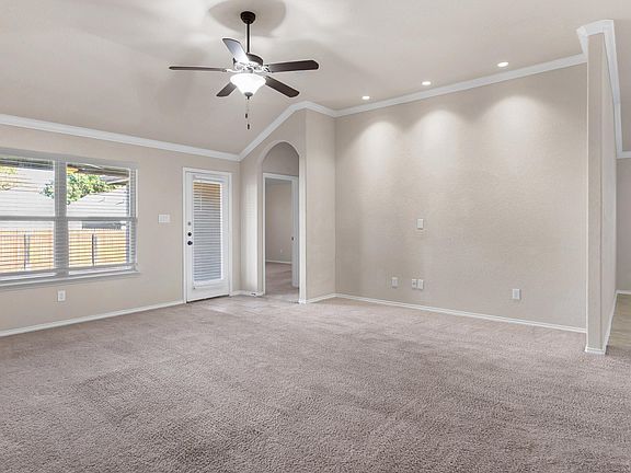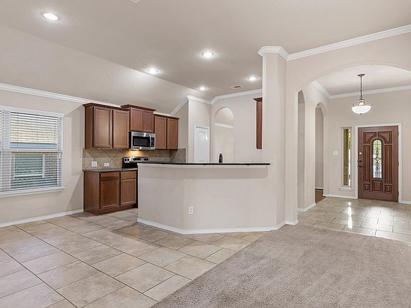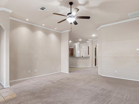 This beautiful single-story residence is move-in ready, offering a warm ambiance and a thoughtfully designed layout. A welcoming entryway opens to a versatile front room-ideal for a home office, formal dining area, or additional living space-before leading into a bright, open-concept living room filled with natural light. The kitchen is a chef's delight, featuring elegant granite countertops, a smooth cooktop, a stylish tile backsplash, and ample cabinetry for all your storage needs. Tile flooring flows seamlessly through the kitchen and dining areas, adding a touch of sophistication and easy maintenance. The home offers three generously sized bedrooms, including a private primary suite tucked away for relaxation, complete with a garden-style soaking tub, separate shower, and spacious walk-in closet. Additional highlights include a two-car garage, washer and dryer connections, and central air conditioning for year-round comfort. Outside, unwind on the lovely covered patio-perfect for morning coffee or weekend barbecues-while enjoying the peaceful outdoor space that makes this home truly special.