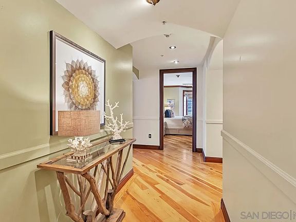 Luxury living awaits in this exquisite single-level condo in Regatta Bay, boasting views of the Coronado Bridge. This spacious 2-bedroom, plus optional 3rd bedroom/office condo showcases impeccable craftsmanship and meticulous attention to detail throughout with rich woods, fine stones, picture frame wainscoting and intricate crown molding creating an ambiance of high-end beauty. The gourmet kitchen boasts Viking appliances, granite counters, beverage cooler, and large serving island/bar sure to impress. The primary bedroom is an expansive retreat with a spa-like bathroom including a jacuzzi tub, dual sinks and vast shower. The open design is an entertainer’s dream, featuring 750 square foot covered patio/balcony with built in BBQ, sink, fireplace, and cozy fire pit. Custom improvements including a separate bar room with a full-size wine refrigerator, hickory wood floors, Sonos sound system, modern lighting, remote blinds, spacious closets, and gorgeous built-ins. Included are two parking spots in the secure, gated underground parking plus storage. Every detail of this property has been meticulously curated to offer the ultimate luxury in living. This superior location is across the street from the Bay, just steps to the historic Ferry Landing featuring amazing restaurants and shopping against the breathtaking backdrop of the downtown San Diego skyline.