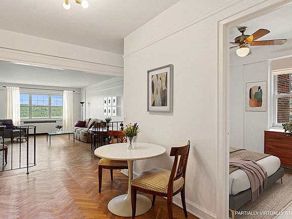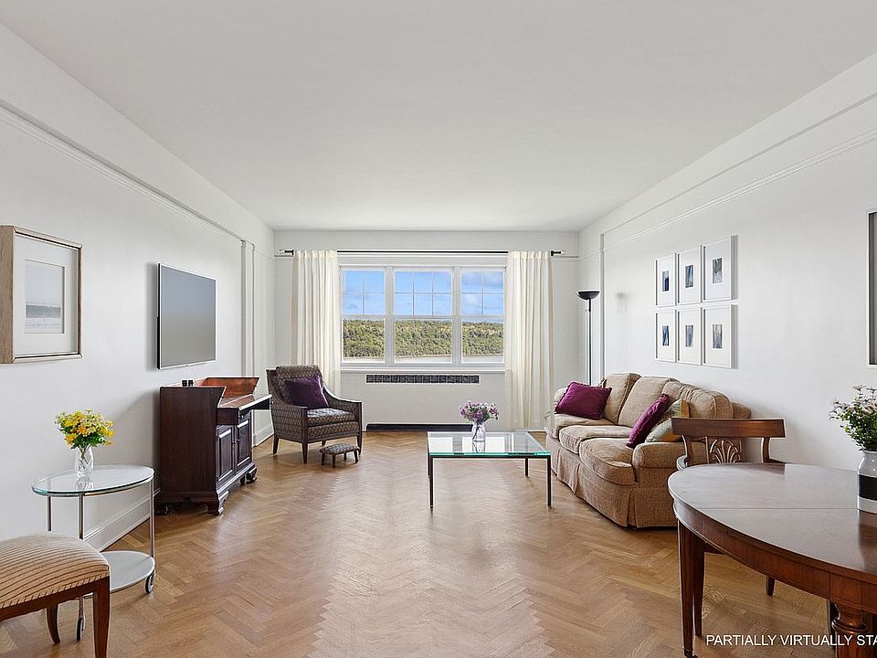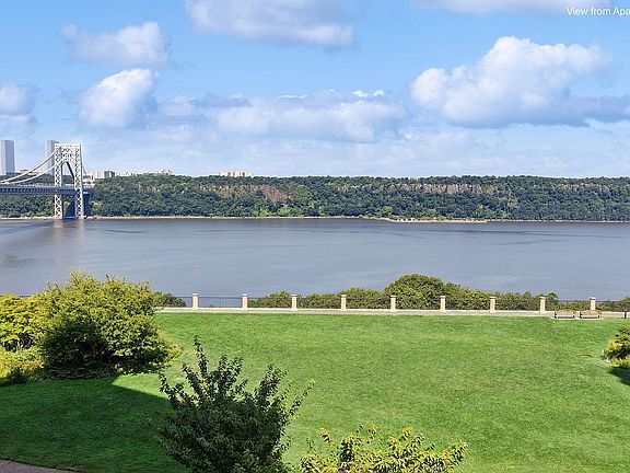 A gracious entry foyer opens into an expansive sunken living room, ideal for entertaining or relaxing as you watch sailboats boats drift by, the George Washington bridge visible to the west. The generous primary bedroom offers two exposures, including a triple-paned bay window framing the spectacular scenery. The second bedroom enjoys open northeast exposures and works perfectly as a guest room, home office, or cozy den.