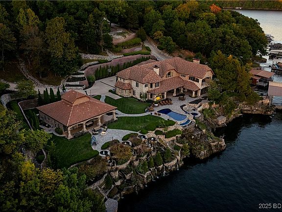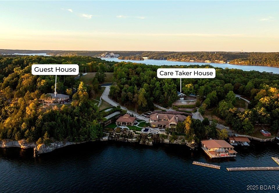 A Legendary Estate at Lake of the Ozarks Perched on a bluff with panoramic main channel views at the 28MM, this iconic estate is a true architectural masterpiece—crafted for luxury living, entertaining, & unforgettable experiences. From the moment you enter, you’ll notice the exquisite finishes: Brazilian cherry wood floors, granite tile, hand-crafted African mahogany doors, & custom crown molding. Indoor and outdoor living blend seamlessly with a screened-in outdoor kitchen—perfect for entertaining. Breathtaking views from the infinity-edge pool, cascading into a newly built pool house w/ a private guest suite for ultimate comfort and privacy. Multiple waterfalls & lush landscaping create a resort-like ambiance, while large wave breaks protect your dock & boats. Beyond the main home are two fully remodeled guest houses: updated in 2024 & furnished by John Elliott Interiors. Amenities include: Pickleball court, fully furnished turnkey interiors, Easy walk to dock, 3 separate living quarters, Blufftop privacy. Whether you're seeking a private lakeside retreat or a show-stopping corporate getaway, this estate delivers an unrivaled lifestyle in one of the Lake’s most coveted locations