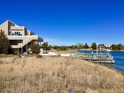 Located in one of Southampton's only true beachy summer resort locations! This house is the only one in the private community that is waterfront on three sides and has views from every single window. Just renovated and decorated top to bottom, you can be the first to enjoy it! This sleek Contemporary home offers an open layout on the main level with multiple decks both open and covered, making it perfect for relaxing privately or entertaining. The kitchen offers commercial-grade appliances, or you can cook out. The large master is en suite and has a private covered balcony overlooking the beach. There are two generous-sized guest bedrooms and two and a half baths. Enjoy the lower level indoor/outdoor rec room with bar, ping pong and darts, or community tennis, handball, or basketball courts. Sun on your private backyard beach also moments from the wide sandy community beach. Utilize the private boat slips and floating docks just outside the door - all ready for that spontaneous cruise! If you are looking for a real summer beach experience, this house has it all!