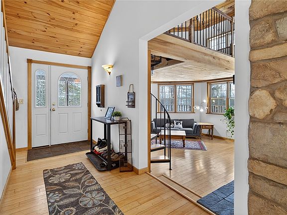 Soaring cathedral ceilings and warm natural woodwork anchor the main living area, highlighted by a striking double-sided stone fireplace. Bamboo flooring and repurposed plank floors add character and sustainability throughout the home. The home offers five bedrooms (septic approved for four) and three full bathrooms.