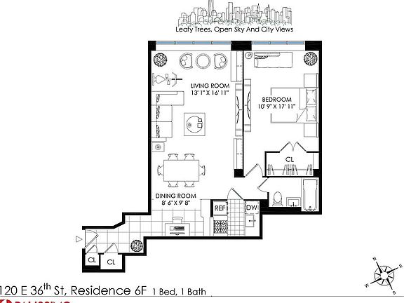 Both the living room and bedroom have northern exposures and cast a spell with their charming views of brownstones, green tree tops and the historic Chrysler Building. The apartment features bruce engineered hardwood floors in sesame color throughout.