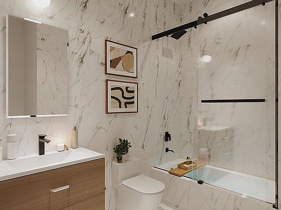 The windowed sleeping area has a large reach-in closet, and the pristine three-piece bathroom includes matte black fixtures and Everlast Arabescato porcelain tile walls and floors. A custom floating vanity sits beneath an inset mirrored medicine cabinet, and a wall of glass reveals a walk-in shower. An in-unit washer/dryer completes the home.