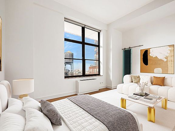 Inside this bright and airy high-floor sanctuary, ceilings rise 14 feet high over hardwood floors and expansive walls, perfect for your prized art collection. The large living area provides a generous footprint for seating, dining, sleeping and home office areas alongside sunset views that skim over the neighboring rooftops. The well-appointed Pullman kitchen features excellent cabinet space and stainless steel appliances, including a cooktop, refrigerator, dishwasher and built-in microwave. In the full bathroom, you'll find a large tub/shower, roomy vanity and wide medicine cabinet surrounded by floor-to-ceiling tile. Frosted glass barn doors reveal two extra-large closets with built-in shelving systems, adding excellent storage to this stunning Upper East Side sanctuary.