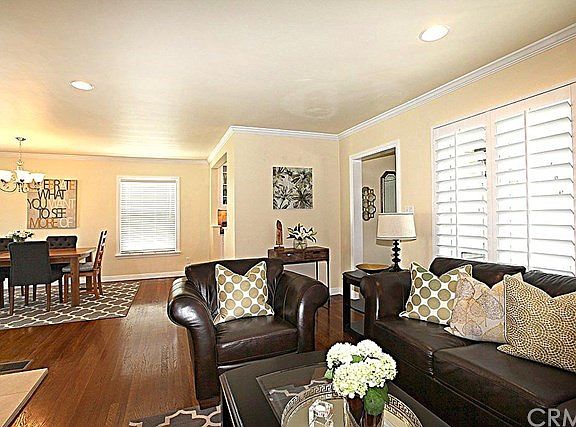 SPECTACULAR SINGLE STORY BUNGALOW WITH EXQUISITE UPGRADES ~ Charming interior entry leads to open concept floor plan that allows easy furniture arrangement ~ Formal living room with recessed lighting and fireplace with travertine tile and custom mantle that adds a decorator touch ~ Formal dining room that is spacious enough for large dinner gatherings ~ Dining room opens to covered deck for outdoor enjoyment ~ Cozy nook off the dining room that would be perfect for a small office ~ Tastefully remodeled kitchen features stainless appliances, recessed lighting, well-organized cabinets, pantry and extra storage ~ Convenient guest bath off kitchen ~ Hardwood flooring ~ UPGRADES GALORE... Dual paned windows, paneled interior doors and front door, custom window coverings, plantation shutters, contemporary wall colors, baseboards and crown molding, bathroom pedestal sink and rainwater shower door, mirrored closet doors, vinyl fencing and patio pavers ~ 2 car attached dry walled garage with epoxy flooring ~ Easy outdoor entertainment area with covered deck for casual dining and relaxing, oversized patio with pavers, spacious grassy area and spa ~ Nice curb appeal ~ Impeccable landscaping ~ RV potential ~ This is a value packed comfortable home !!!
