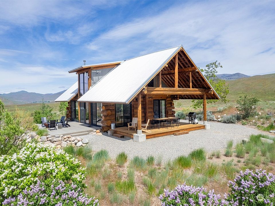 Sweeping Sawtooth and N Cascade views backdrop rolling shrub steppe hillsides and wildlife rich sub irrigated sanctuaries on this 20 acre uplands gem. Log, glass, and steel come together creating a 1125sf 2 bed 2 bath work of art. Radiant floor heating, ductless mini split, and free standing woodburning stove create a comfortable climate year round. Custom lighting and railings, excellent use of space, slate flooring, large soaking tub and primary bedroom on main floor. Expansive covered south facing deck for shady entertaining or quiet observation of harriers, hawks, kestrels, hummingbirds and deer migration. 1700 gallon water cistern w/ system pumps and electronics replaced in 2020. Fenced garden, fruit trees, automatic watering system.