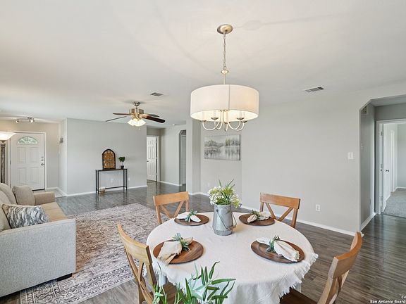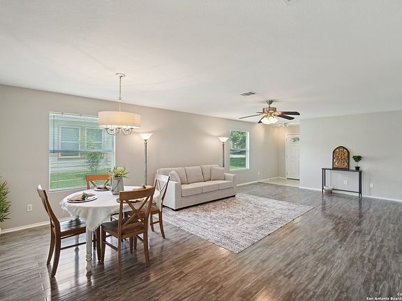 Stunning Home in Prime Location! This exquisite 3-bedroom, 2-bathroom residence offers the perfect blend of comfort and style. Boasting an open floor plan, the spacious living area is perfect for both relaxation and entertaining. Enjoy the elegance of hardwood floors throughout the main areas, complemented by brand new carpet in all bedrooms. Fresh paint throughout the interior adds a crisp, modern touch to this beautiful home. One bedroom, filled with natural light, is perfect as a home office. Located just minutes from Randolph Brooks, with quick access to IH35, New Braunfels, and Forum Parkway, you'll enjoy abundant shopping and dining options. Don't miss the chance to own this desirable, move-in ready home!