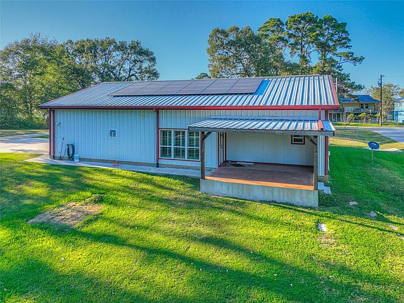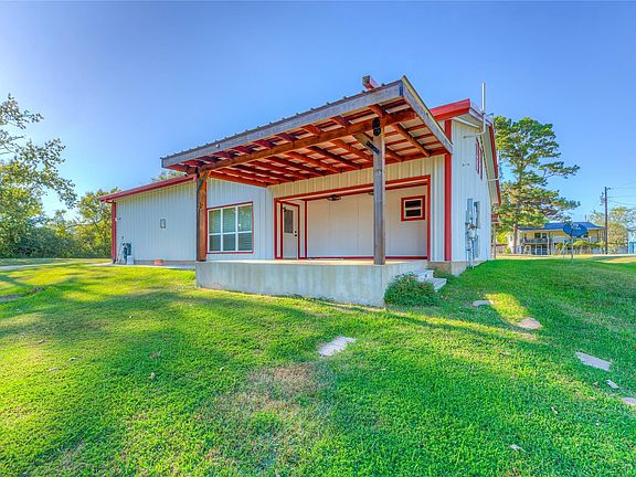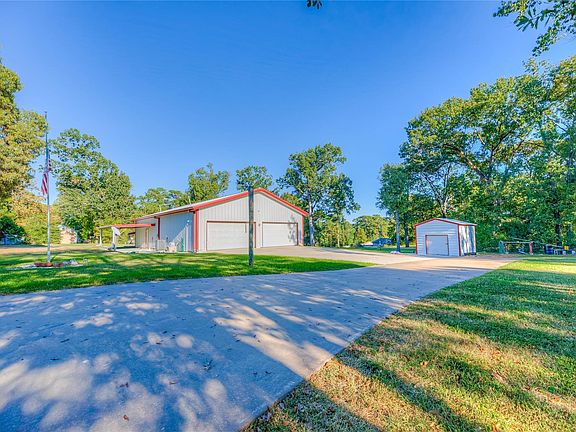 This barndominium has a spacious layout with a large size lot totaling 34,450 sqft 2 Bedroom 3 bath featuring a second bedroom/loft with a walk-in closet and tub/shower, and a main master suite downstairs with double sinks, soaking tub, and shower. It has tile floors, stained wood plank ceilings, a large epoxy-floored garage with a roll-up door, gutters, owned solar panels, a concrete driveway, a 12x20 shed, RV/boat paring, and a small lake view, all just minutes from the lake and town.