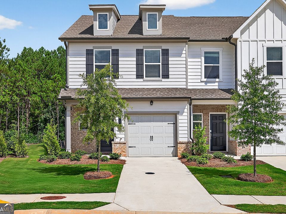Welcome Home! This former model home is only one year old and brimming with designer touches throughout! As an end-unit townhome with timeless brick accents, it offers both style and convenience. Step inside to an open concept layout where LVP flooring flows seamlessly across the main level for easy maintenance. The kitchen shines with sleek black cabinetry, granite countertops, a sizeable island, and stainless steel appliances - including a side-by-side refrigerator. Overlooking the spacious family room, it's perfect for entertaining or everyday living. The family room opens through a full-light sliding door to a private rear patio with privacy panels - ideal for enjoying your morning coffee. An abundance of recessed lighting and a designer wallpapered powder room complete the main level. Upstairs, retreat to the primary suite, highlighted by two walk in closets, plus a designer wallpaper accent wall for that extra wow factor. The primary ensuite bathroom features a double vanity with painted cabinetry, LVP flooring, and a modern subway tile shower with glass door. Two additional bedrooms share a full bath with painted cabinets and LVP flooring, while a spacious laundry room (washer & dryer INCLUDED!) adds convenience. This home truly combines style, function, and low-maintenance living. Don't miss the chance to make it YOURS!