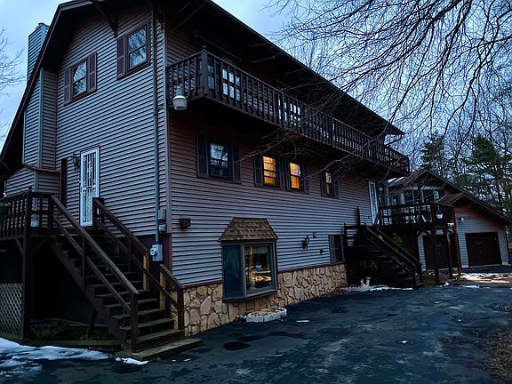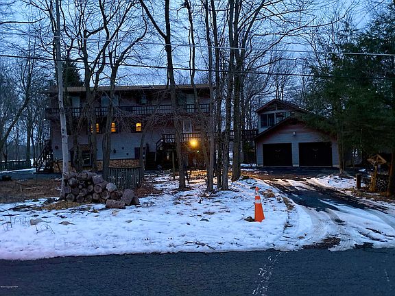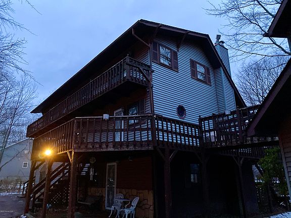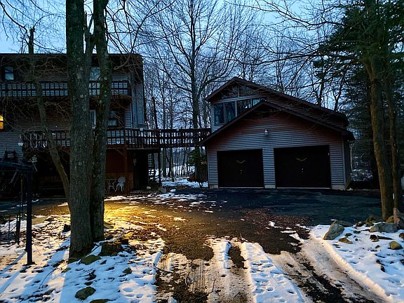 LAKEFRONT HOME on an ACRE of Land on PICTURESQUE PINE TREE LAKE!! THIS JUMBO SIZED 3 STORY HOME HAS MULTIPLE DECKS AND AN ARTIST STUDIO ABOVE GARAGE. 5 BEDROOMS and 3 BATHS, Gorgeous wood beams and knotty pine ceilings, wood floors, 2 KITCHENS and a Wet Bar, 3 FIREPLACES, plus an oversized 2 car garage and a generator. This home would make an amazing multi-generational home in the amenity filled community of Emerald Lakes. Close to all the Poconos Attractions and commuter friendly location.
