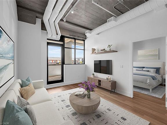 Where heritage charm meets modern edge. Step into this authentic hard-loft conversion that pairs century-old character with contemporary design. This bright and open 1-bed, 1-bath condo showcases soaring 10-foot ceilings, oversized windows, and a fluid layout that makes a statement the moment you walk in. Thoughtful upgrades include a sleek waterfall quartz countertop and upgraded baseboards for a polished, elevated finish. Enjoy the convenience of a separately deeded parking space and storage locker. Just minutes from Guelphs vibrant downtown: coffee shops, boutiques, and dining are all close at hand, yet the building itself exudes soul, history and genuine warmth. Your private 150 sq. ft. balcony becomes an extension of your living space, perfect for morning coffee or evening stargazing. Inside, the clean, modern aesthetic is complemented by access to premium amenities: a 2,200 sq. ft. rooftop patio with BBQ, fire cube, and lounge seating; heated bike ramp with indoor storage; a fully equipped gym; games room; and even a pet wash for your four-legged friend. Whether youre working from home, entertaining, or simply enjoying the vibe, this loft delivers the best of boutique, urban living.