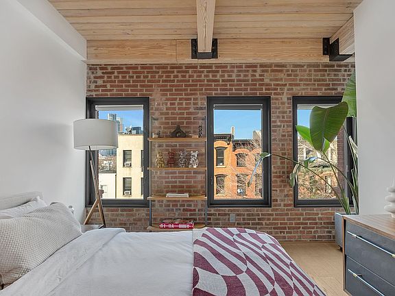 This elegantly appointed two-bedroom, two-bathroom residence spans 1,159 square feet of refined living space and includes a private 174 sq. ft. terrace, perfect for alfresco entertaining or quiet retreat. Soaring ceilings and a full wall of oversized, double-pane Low-E windows flood the expansive living and dining areas with natural light, while exposed 19th-century redbrick walls lend a sense of historic character and warmth.