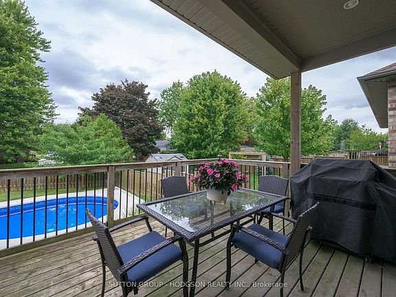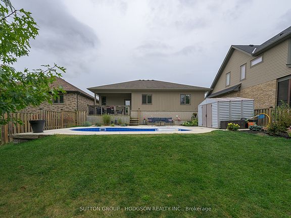 From the moment you arrive, this home stands out with its stone façade, concrete driveway, and welcoming curb appeal. Tucked on a quiet street in Lucan, this bungalow is designed for comfortable one-floor living, with an airy, open layout and a backyard that feels like your own private resort. Step inside to a large vaulted great room filled with natural light from oversized windows, open to the modern kitchen featuring abundant cabinetry, stainless steel appliances, and an expansive island perfect for quick meals or gathering with friends. The dining area flows seamlessly, making everyday living and holiday entertaining a breeze. The primary bedroom offers a spacious walk-in closet and cheater ensuite, while the second bedroom is ideal for kids, guests, or a home office. The lower level impresses with its high ceilings, pot lighting expansive rec and games area, bright guest bedroom, and full bathroom, a perfect teen retreat or welcoming space for visiting family. There's also plenty of storage to keep everything organized. The backyard is truly a highlight. Fully fenced, it features a sparkling in-ground pool, a covered patio for shade, and outdoor living areas for lounging, dining, or hosting summer parties. With green space, fire pit area, shed, beautiful landscaping, and room to relax, this is a setting you'll enjoy from spring through fall. Located in the thriving town of Lucan, you'll love the peace and quiet of small-town living with convenient access to London just minutes away. Stylish, functional, and move-in ready, this home checks every box and is a must-see.
