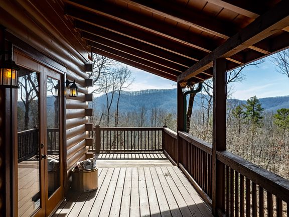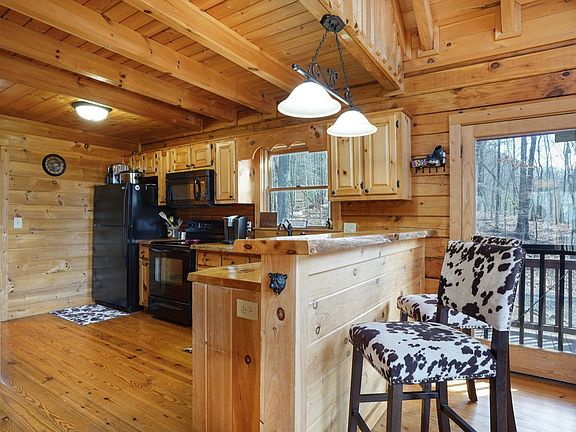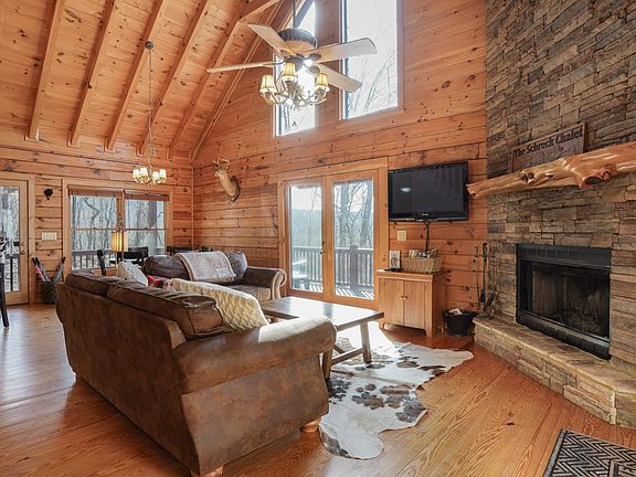 Total privacy from this real log cabin with year round mountain views! Step inside to find a warm & inviting great room with beautiful wood beams, stack stone wood burning fireplace & wall of windows to take in the vistas. Spacious eat in kitchen & dining area w/ gorgeous wood countertops, stainless appliances & pantry. Large ensuite bedroom round out the main level. Upstairs features the primary suite w/ private screened porch, tile shower, jetted tub and loft area perfect for a home office, teen hangout, or reading nook. Full finished terrace level features an entertainment area, additional bedroom and full bath. Fire pit area, and hot tub are perfect for those chilly mountain nights & outdoor entertaining. This home would make a fantastic vacation rental, or second home getaway!