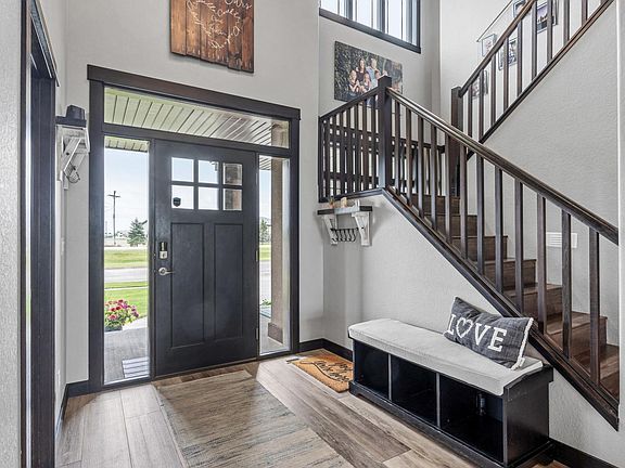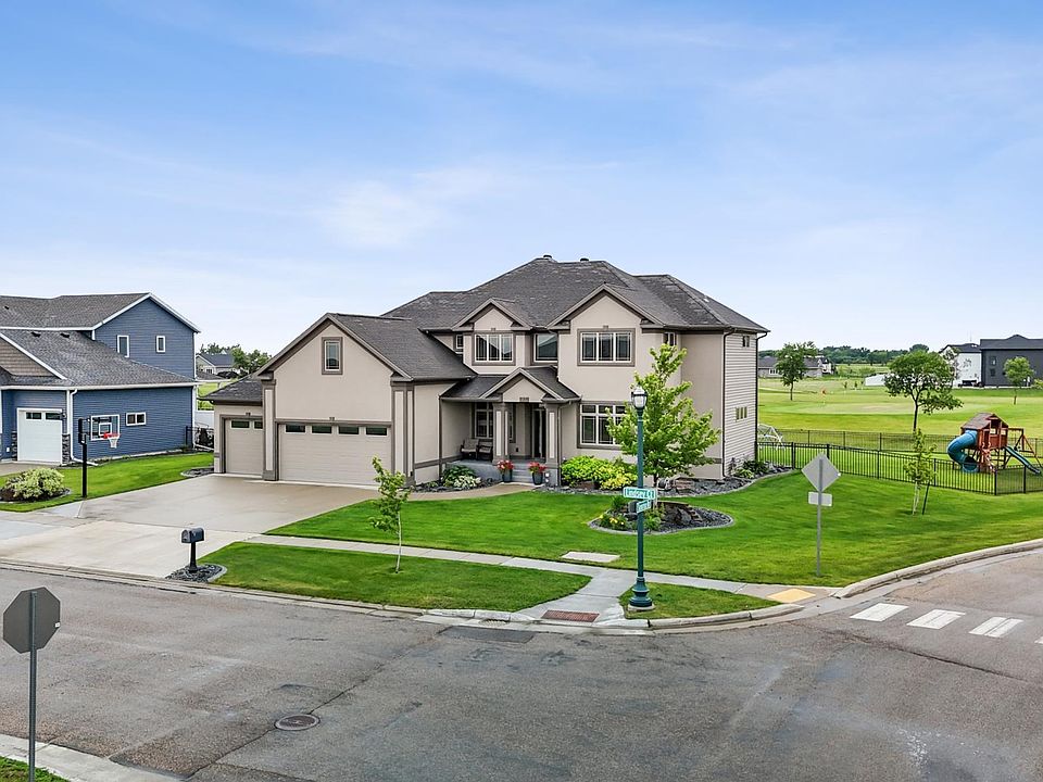 Situated on a nearly 1/2-acre lot with windows galore and peaceful views of the Mapleton Golf Course, this spacious 6+ bedroom home balances lux amenities with everyday comfort. At the heart of the home, the chef’s kitchen features an oversized island, walk-in pantry, gas range, wall ovens, and a convenient coffee-pot filler. The main floor includes a large mudroom and half bath, formal dining (or sunroom) that opens to the backyard, a dedicated office, and a living room where expansive windows frame stunning sunset views over the course. Upstairs, find four generously sized bedrooms, ALL with walk-in closets, including the primary suite with panoramic golf course views and a huge, spa-inspired full bath. The basement features a large family room, flex/game space, future wet bar, dedicated storage, plus an additional bedroom and full bath. Thoughtful yard placement and low-maintenance landscaping create a peaceful retreat, complemented by a fully fenced backyard, serene views, and a cozy fire pit perfect for crisp evenings. The heated 4-car garage, is complete with epoxy floors and a rear overhead door for convenient back yard access. They've thought of everything! Located in a vibrant community just minutes from Fargo —this home is truly made for real life and lasting memories. Come take a look.