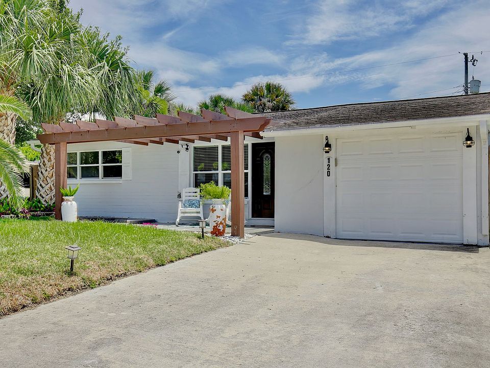 AVAILABLE FOR RENT FULLY FURNISHED FOR $2500! Experience coastal living at its finest in this charming haven, where you'll be walking distance from public beach access, fishing piers and riverside parkstailored for those who dream of a life by the water. Presenting a cheery exterior complemented by a pergola framed entrance, this home welcomes you to beachside bliss. Step inside this FULLY FURNISHED BEACH HOME to discover an open and airy floor plan that exudes warmth and style, with wood look vinyl floors and a harmonious palette of neutral colors throughout. The rustic light fixtures add character, while the living room draws you in with its wood panel TV accent wall featuring a cozy electric fireplace. The living space flows seamlessly into a dining area boasting built in booth seating, perfect for gathering with friends and family. Enjoy cooking family favorites in the light and bright kitchen, equipped with lustrous granite countertops and stainless steel appliances. Your private retreat awaits through French doors in the primary bedroom, offering serene views of the tropical backyard. Across the hall, the modern bathroom showcases a sleek glass door shower and stylish vanity. Guests will feel right at home in the spacious and welcoming bedrooms, while the second bathroom features a classic tub/shower combo and chic beadboard paneling. The laundry room completes the interior with a Whirlpool washer and dryer, ample cabinet space, and wooden floating shelves. Your personal tropical oasis awaits outdoors, featuring a covered paver patio with ceiling fans and enchanting lantern lighting. Follow the stone walkway to a cozy hammock corner, perfect for summer grilling and relaxation. The fenced yard is an ideal playground for pets and outdoor activities. Situated just steps away from Publix, dining, and leisure at Argosy Park with beach access, and also less than a mile from public fishing docks and parks on the Halifax River, this home combines the serenity of beach living with the convenience of nearby amenities. Spend the weekends fishing, boating, and soaking up the Florida sun.