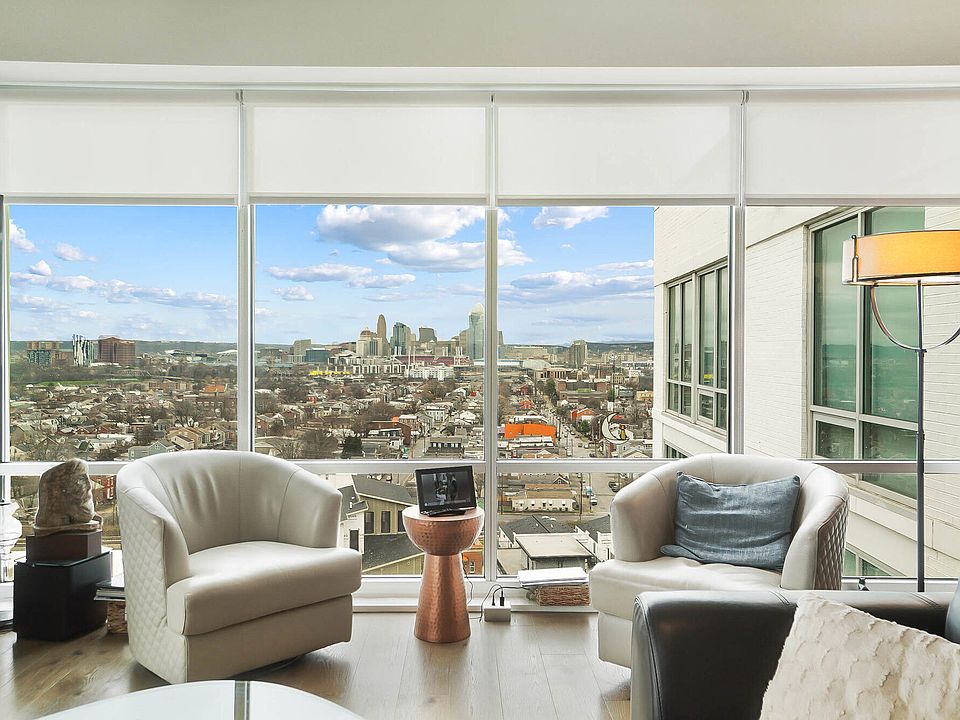 Discover a new level of luxury living in this modern, corner-unit condo where sleek design meets the stunning backdrop of the Cincinnati skyline. Offering 2 spacious bedrooms, 2.5 baths, and a private study, this residence is defined by soaring ceilings, exposed beams, and walls of windows that bathe the home in natural light while framing unforgettable views. You can enjoy the Reds fireworks right from your balcony! The gourmet kitchen is a showpiece with custom cabinetry, generous storage, gas burner cooktop, wall oven, and top-tier stainless appliances perfect for entertaining. Every detail has been thoughtfully curated, from the open living spaces to the serene bedrooms with spa-inspired en-suite baths. A detached 1-car garage plus additional indoor storage in the parking garage add convenience, while the community elevates your lifestyle with exclusive amenities: sip cocktails at the rooftop bar overlooking the skyline, host gatherings in the elegant club room, relax in the courtyard, or lounge poolside. This isn't just a home, it's a statement of style and sophistication. Welcome to Skypoint Luxury Condos!