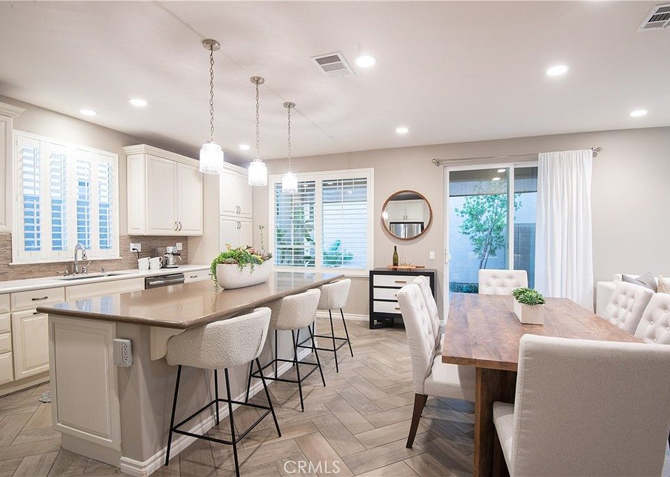 Step inside to a light, bright, and open great room that flows seamlessly into the dining area and gourmet kitchen. Elegant herringbone-pattern flooring, soft-close cabinetry, custom shutters, designer paint finishes, and LED recessed lighting elevate the home’s contemporary style. The kitchen boasts a large center island, premium Samsung appliances, and ample storage. A private wrap-around patio extends the living space outdoors, perfect for morning coffee & entertaining.