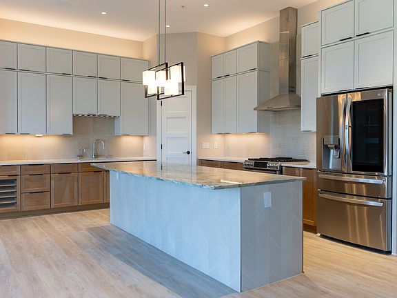 Step inside to soaring 11-foot ceilings in the main living areas, highlighted by sleek black-framed windows. The gourmet kitchen boasts Quartz countertops, soft-close wood cabinetry, an expansive island, wine fridge, smart appliances, and decorative mini-can lighting. Luxury vinyl plank flooring flows throughout, complemented by designer touches like custom bedroom closets, tile bathroom floors, and spa-inspired showers.