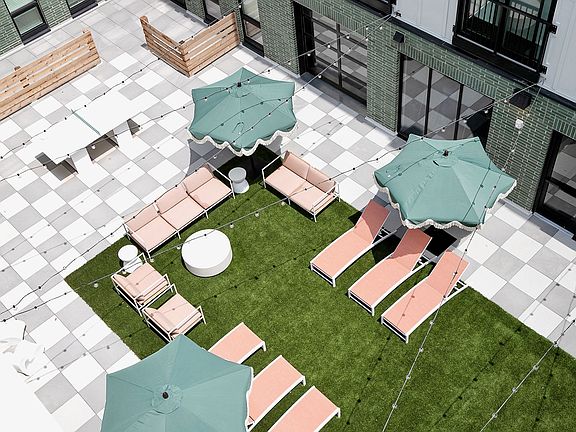 - Exterior features: Courtyard, Flexible Payment Options, Large Picture Windows, On-Site Maintenance, On-Site Management, Package Receiving, Pet Friendly, Pool Table, Quartz Countertops, Rooftop Deck, Shuffleboard Table, Stainless Steel Appliances, TV Lounge, Tile Backsplash, Underground Parking, Wood-Style LVP Flooring