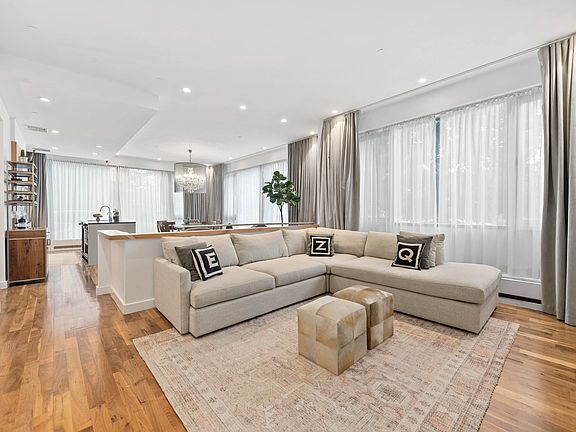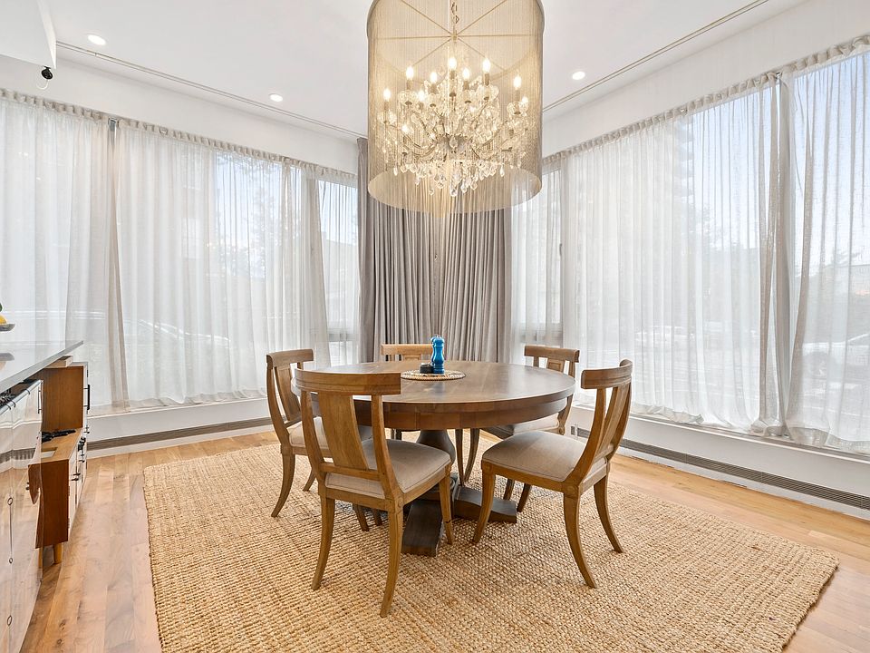 The main level of this expansive home has two exposures with floor-to-ceiling windows. The large living room can accommodate multiple couches and offers wall space for art. The dining room is flanked by windows and features a Restoration Hardware lighting fixture. It is the perfect space for entertaining.