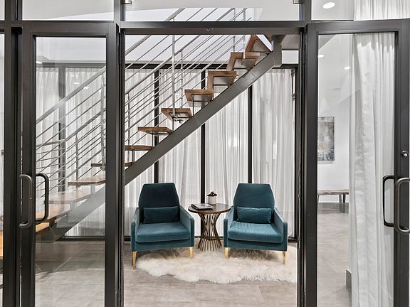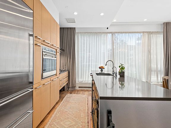 The open kitchen has a window and a long center island with a breakfast bar. Top of the line appliances include a built-in Sub-Zero refrigerator, Wolf gas cooktop with a stainless steel hood, Wolf convection wall oven, and a dishwasher. Custom cabinetry and Caesarstone countertops complete the package. A bedroom has been converted into two offices perfect for working from home. It can easily be converted back to a bedroom with two closets and enough space for a king size bed. There are two spa-like full bathrooms featuring calming colors and warm wood tones. This level of the home has walnut floors throughout, a welcoming foyer, double door coat closet and a large walk in closet. Downstairs is the primary and nursery. Both behind elegant steel and glass walls. The primary has an en-suite bath with double vanity and an entire wall of built in closets. This level also has a second foyer with walk in closet, a half bath, and laundry room with washer/dryer.
