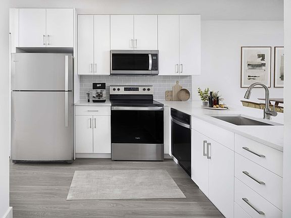- Exterior features: 24-hour emergency maintenance, 9 foot ceilings, Barbecue, Brushed nickel hardware, Business Center, Concierge, Double-sink vanity, Entry coat closet, Garages and carports available, Gray subway tile backsplash and USB outlets, Hardwood-style flooring throughout, High endurance fitness zone, Housekeeping, Loft Suite, Modern white cabinetry, white quartz countertops, Non-smoking amenity areas, Online Rent Payment, Parking, Sleek white cabinets, Smart door locks with smartphone compatibility, Stainless steel appliances, Tennis Court(s), Track lighting, View Type: Panoramic lake view, residents can move throughout the community and in
