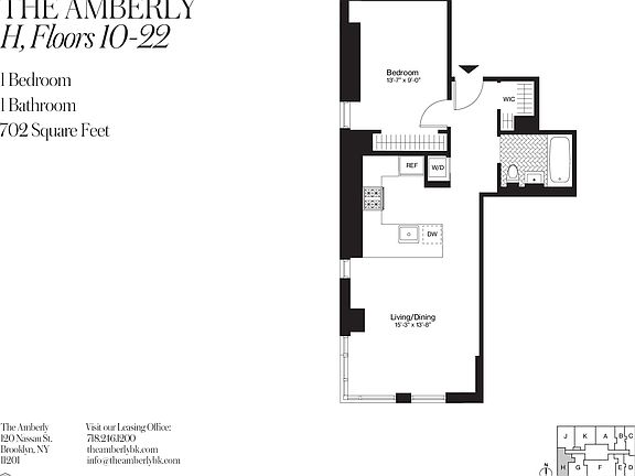 Thoughtfully-designed, the studio to three-bedroom homes at The Amberly come complete with floor-to-ceiling windows with custom shades and walnut wide-plank flooring. All kitchens include Caesarstone waterfall-edge countertops and baths are finished with elegant herringbone ceramic tile. A Bosch washer/dryer can also be found in each residence.