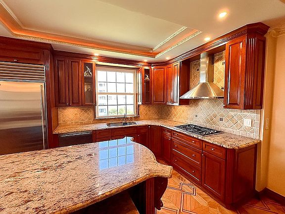 Where Sophisticated Design Meets Resort-Style Living This beautifully renovated two-bedroom, two-bath residence offers approximately 1,200 square feet of professionally designed living space in a coveted oceanfront community. Crafted with European-imported materials and a meticulous attention to detail, the home features a warm, elegant kitchen appointed with granite countertops, rich wood cabinetry, a professional-grade stainless steel refrigerator, and a vented gas cooktop beneath a custom hood. The formal dining area is bathed in natural light, where custom ceiling details and an ornate chandelier create an atmosphere of timeless sophistication. The bathrooms are equally refined, showcasing marble finishes, gold hardware, and bespoke millwork. Custom closets provide abundant storage with fully built-out shelving and cabinetry. Step out onto your private balcony to enjoy views of the ocean and the fresh coastal breeze. From morning boardwalk strolls and espresso runs to gourmet markets and fine dining, everything you need is just moments away. The express train nearby offers easy access to Manhattan, bringing the best of both worlds-seaside serenity and city convenience. Within the gated complex, residents enjoy a suite of resort-style amenities including 24/7 security, indoor and outdoor pools, a fitness center, direct beach access, and more. Live every day like you're on vacation-with ocean views, luxurious finishes, and the best amenities the city has to offer right at your doorstep.