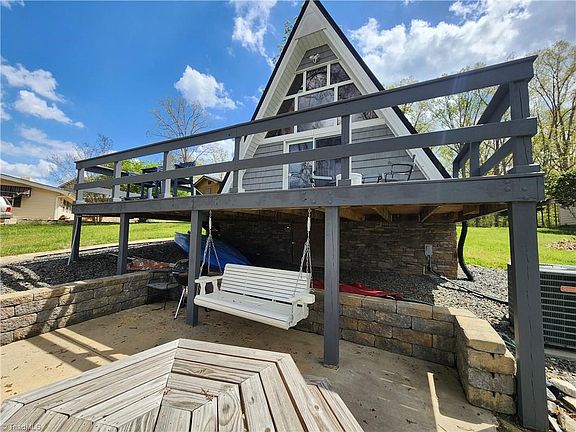 Lakefront A-Frame Retreat with Modern Updates, Fully Furnished & Move-In Ready! Welcome to 120 Ole Point Ln, a beautifully updated A-frame home on High Rock Lake. Perfect for year-round living or an amazing vacation rental investment. This charming 1-bedroom, 1-bathroom home features vaulted ceilings, an open loft for extra sleeping and room for a second full bed or storage space, and stunning panoramic water views. Thoughtfully renovated with modern comforts, it includes new water heater, encapsulated crawl space for energy efficiency, updated decking perfect for outdoor entertaining, private dock for fishing, kayaking, or relaxing by the water. Situated on a private road with limited through traffic, the location offers peace and privacy while still being just 6 miles from I-85, making it an easy drive from Charlotte, Winston-Salem, or Greensboro. Whether you're seeking a serene escape, a cozy full-time residence, or a ready-to-go short-term rental, this home checks all the boxes.