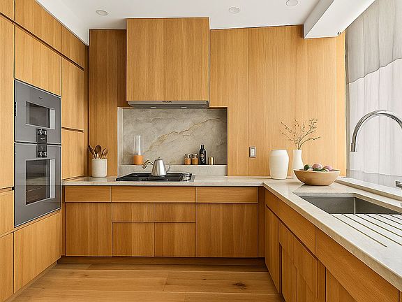 At the heart of the space, a striking wall of custom white oak cabinetry anchors the open living, kitchen, and dining area. Designed to seamlessly integrate countertop and credenza, the millwork conceals HVAC systems, carves out a discreet desk niche for remote work, and offers ample storage with cascading profiles that feature integrated finger pulls—eliminating the need for visible hardware. Rotated wood grains and a horizontal layout lend visual depth and a sense of expansion, while quartzite countertops—bookmatched with delicate green veining—and sleek Gaggenau appliances elevate the kitchen with quiet sophistication.