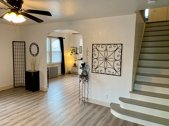 First floor features a spacious living room and separate dining room/kitchen all with brand new durable vinyl flooring. All new kitchen with a bar for casual seating, brand new range and microwave and high quality cabinets, countertops and decorative lighting. Convenient first floor half bathroom. Ceiling fans throughout.