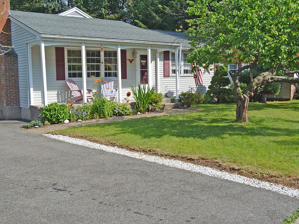 Remarkable layout, must be seen! This 3 BR, 2.5 bath ranch home is wonderfully located in the desirable South End of Meriden, on a quiet cul-de-sac, complete with sidewalks. The oversized eat-in kitchen is adorned with gorgeous, rarely seen, hardwood cathedral ceiling with skylights. Kitchen also features an aluminum tile backsplash, fabulous half circle specialty window, and ample counter space. It opens into a large DR, brightened by natural sunlight streaming through the abundant windows. Gleaming hardwood floors throughout, and most rooms are graced with convenient built-ins. Formal LR boasts a cozy fireplace, picture windows, and exposed ceiling beams. Additional 1000 Sq. Ft. in finished basement includes a beautifully appointed full bath. Lower level walk out gives this space the potential for an in-law suite or extra apartment. Bonus features include: charming front porch, mudroom entranceway with built-in shelving, spacious deck, and private level yard. Move right in today!