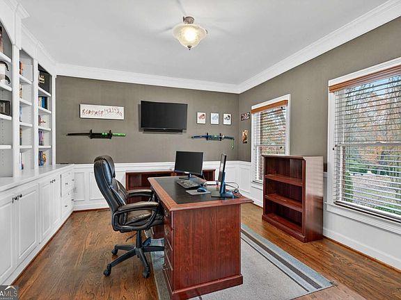 Welcome to this beautiful three-sided brick hidden gem, perfectly situated on one level acre lot among other luxurious in the Stonehedge subdivision. This six-bedroom, five and half bath home with a fully finished terrace level is truly an entertainer's dream! Great opportunity for you to add a little "TLC" and your personal vision and make it your dream home. The welcoming front porch leads to the ornate double glass doors, which open into a two-story foyer accented by extensive decorative molding and hardwood floors throughout the main level. There is a private study featuring French doors and a full wall of custom built-in bookcases. The formal dining room flows seamlessly into a spacious eat-in kitchen, complete with expansive cabinetry, large island, breakfast area, and mudroom/pantry leading to the garage. Adjacent to the kitchen, the keeping room shares a stunning double-sided stone fireplace with the two-story great room, creating a warm and inviting space filled with natural light. The main-level primary suite boasts tray ceilings, plantation shutters, dual vanities, whirlpool tub, separate shower, and private water closet. Upstairs, you'll find four good-sized bedrooms and two shared bathrooms. The finished terrace level is an entertainer's delight-complete with a wet bar, media room, music room, exercise area, bathroom and ample space for recreation and relaxation. A private bedroom with ensuite bath and large closet offers comfort and privacy for guests. Enjoy outdoor living on the large deck overlooking a private backyard, or relax on the front porch. This home combines elegance, functionality, and space for every lifestyle need. Neighborhood amenities include a pool and tennis court. Living at Stone Orchard Court means you're just minutes from Alpharetta and Milton's s best destinations, including Avalon, Halcyon, Ameris Bank Amphitheatre, parks, greenways, shopping and dining.