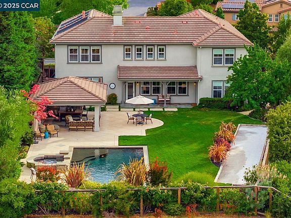 This breathtaking two-story estate offers 6 bedrooms, 6.5 baths, and resort-style luxury in one of Danville’s most coveted neighborhoods. Enter to soaring ceilings, abundant natural light, rich cherry hardwood floors, crown molding, built-in speakers, refined custom finishes and a full security system. To the left, an elegant formal living room with a white mantel and gas fireplace; to the right, a sophisticated den with custom cherry built-ins, ideal for a home office. The chef’s kitchen features a grand island, sumptuous cherry cabinetry, stainless steel appliances with a six-burner stove, and a butler’s pantry with wine fridge opening to an expansive dining room. The lavish primary suite showcases stunning Mt. Diablo views, a spa-like bath with soaking tub, dual vanities, walk-in shower, and a massive custom walk-in closet. Step outside to a private courtyard with fireplace and a fully equipped in-law suite with kitchen, bath, balcony, and separate entry. The entertainer’s backyard dazzles with panoramic Mt. Diablo views, a heated saltwater pool, spa, bocce court, garden beds, and a peaceful fountain. The outdoor kitchen is a chef’s dream with built-in grill, fireplace, warming drawers, fridge, dishwasher, and sink—perfect for luxurious outdoor living.