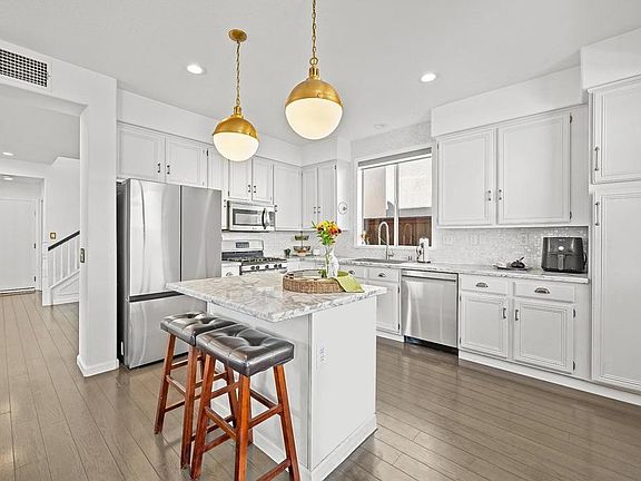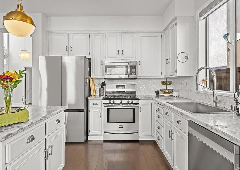 Must see to believe this corner lot designer home in the sought after gated community of Park Lane offers resort style living with a sparkling pool and spa just steps away. Step inside to soaring ceilings, sunlit spaces, and a beautifully updated interior that blends modern design with timeless details. The bright kitchen is a showpiece freshly painted white cabinetry, elegant marble countertops, a stylish backsplash, and a center island with bar seating make it the heart of the home. The open concept layout flows seamlessly into the living room with its cozy fireplace and the dining room’s classic wainscoting. Upstairs, a spacious loft with an enclave offers the perfect spot for a playroom, home office, or media area, or it can be converted to a 4th bedroom. The primary suite is pure serenity adorned with a chandelier, wainscoting, a walk-in closet, and a spa-inspired ensuite featuring dual sinks, a soaking tub, and a walk-in shower. Both secondary bedrooms feature custom wall details, and the upstairs laundry room impresses with mosaic tile flooring, subway tiled walls, and extra storage. Upgrades abound: plantation shutters, chic lighting fixtures, new fence (2022), refrigerator (2022), dishwasher (2024), and more. Enjoy a two-car garage and the ideal location minutes from the beach, close to shopping, dining, and top rated schools. This home is not just move-in ready it’s magazine ready.