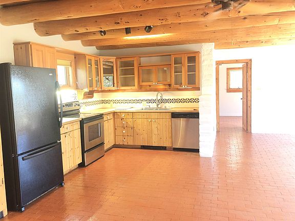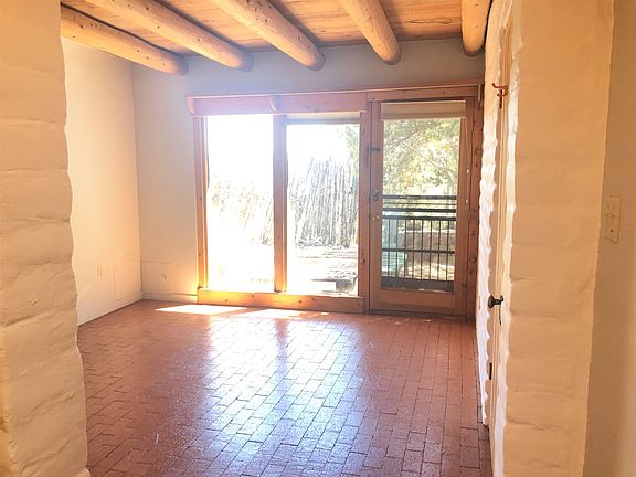 This well maintained property is secluded and private but just 7 minutes from the I-25 exit and 20 minutes to the Santa Fe Plaza. Large windows run the length of the south facing walls of the house, providing unobstructed views and access to the green belt and trail system, as well as passive solar and ample natural light. A large office private office provides opportunity to work productively from home! Each of the bedrooms and the office have french doors leading to the spacious patio. Vigas, brick floors throughout, and wood finishes are just a few of the features that add pueblo style charm to this lovely Eldorado home. Two large rain catchment reservoirs. Adjacent 1.5 acre lot available and listed separately for $76,000.