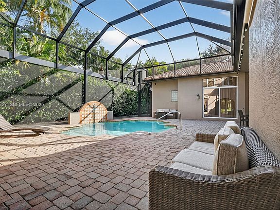 Experience resort-style living in this beautiful 5BR / 4.5BA courtyard home, privately situated at the end of a cul-de-sac in the gated community of Mirabella. A stunning courtyard floor plan centers around the sparkling pool, now enclosed by a brand-new $40,000 screened structure that creates a seamless indoor/outdoor oasis. At night, soft lighting transforms the courtyard into a serene retreat. Large windows with elegant shutters fill the home with natural light. The spacious dining room includes its own wine fridge, perfect for entertaining. The separate poolside guest suite offers ideal accommodations for visitors, extended family, or a private office. With generous living spaces, total privacy, and a beautiful courtyard design, this home brings together comfort, elegance, and true Florida living. Mirabella at Mirasol is a premier gated community offering 24/7 security, a resort-style pool, fitness center, clubhouse, tennis courts, playgrounds, and family-friendly sidewalks throughout, providing an exceptional lifestyle in the heart of Palm Beach Gardens.