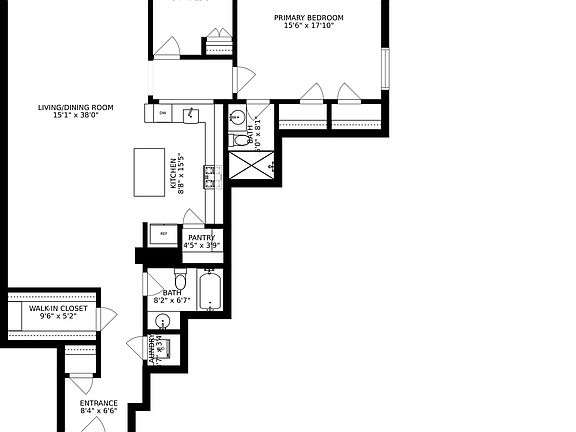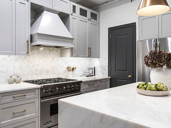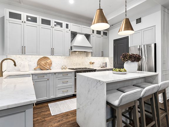 Meticulously renovated, apartment 2B at 120 W 18th St offers an oversized half floor condo unit with 2 bedrooms and 2 full bathrooms. Upon entry you are greeted by 10'2" ceilings, a proper foyer and spacious coat closet which leads down the hall to an open layout living room, dining area and kitchen. The kitchen is outfitted with custom cabinetry, Viking range, oversized GE fridge and Bosch dishwasher. Kitchen island features waterfall quartz countertop and seating for three. The kitchen also includes a full walk-in pantry for added storage space and brass hardware throughout for an elevated touch. The dark stained hardwood floors are complimented by picture frame moldings and finished ceiling with LED recessed lighting. The spacious primary bedroom fits a king sized bed, offers plenty of closet space and has an en-suite white marble bath with standing showing and brass fixtures. The secondary bedroom fits a queen sized bed and has a built out closet. Other features include white marble secondary with tub, washer dryer in unit and massive walk in storage closet.